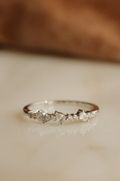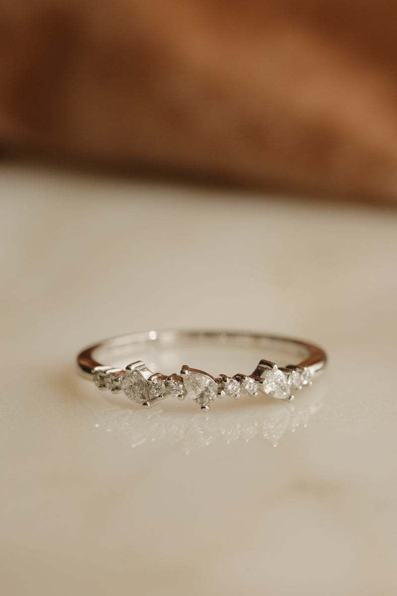Pear shaped diamonds in alternating directions are separated by prong-set round brilliant diamonds. The silhouette is unique and beautiful – refreshing, just like raindrops falling into the ocean.
