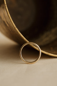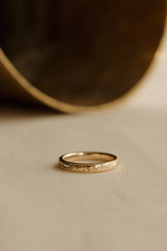 This 3mm gold band is the perfect size for a wider women’s band or a narrow, unobtrusive men’s wedding band. The subtle vine pattern adds a unique touch and visual interest while the band is stick distinctly classic. The recessed pattern is deep enough to last a lifetime without fading away and we love this piece paired with other romantic or floral-inspired pieces.